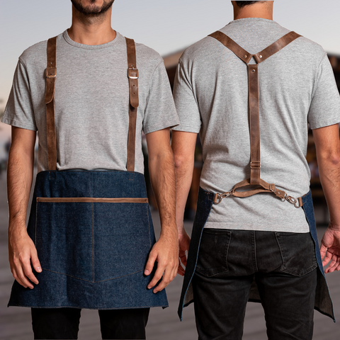 Experience culinary flair with our Denim-Leather Half Apron, complete with adjustable straps for ultimate convenience.