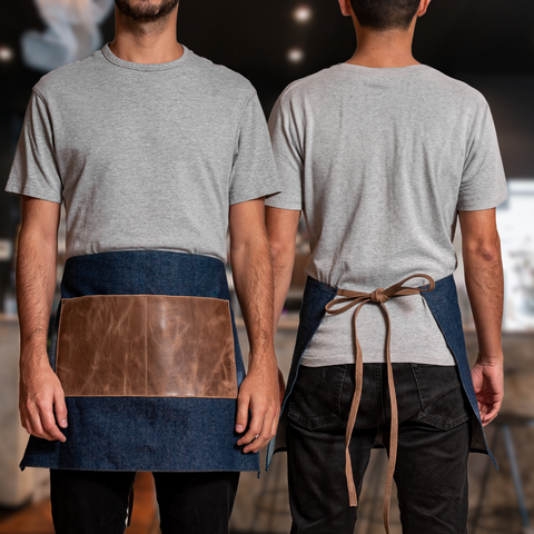 Unleash your culinary creativity with the Denim-Leather Half Apron, where rugged denim meets refined leather for a unique kitchen companion.